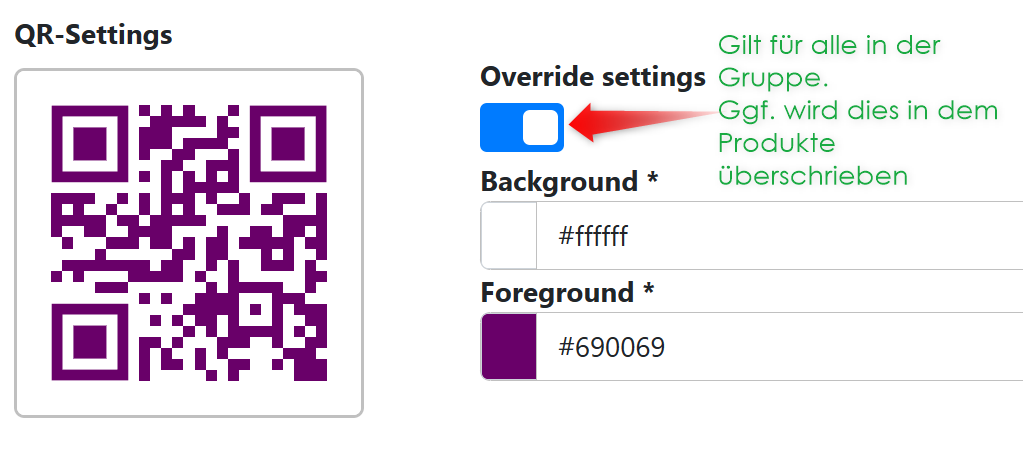 Please note that you can override the colour per product. This makes it possible to define exceptions for the QR code colours within a group without having to create a new group for each colour combination.