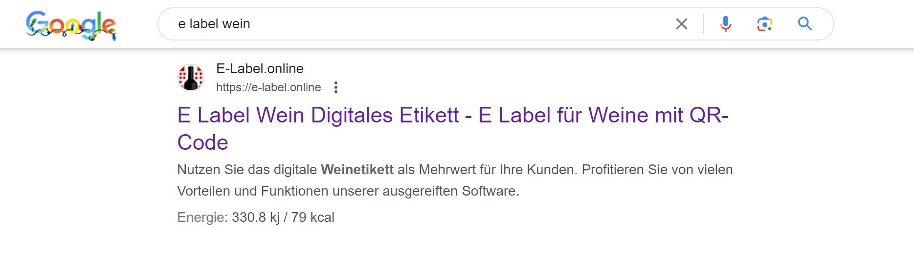 Durch umfangreiche On-Page-Optimierung der Webseite und passendes Online-Marketing durch die Firma QUADRONET und Swisscode, haben wir es geschafft seit Anfang Dezember auf Platz 1 mit dem Suchbegriff: E Label Wein zu schaffen.